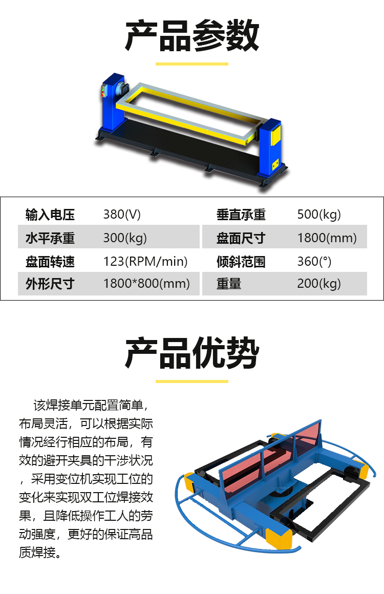 焊接变位机是一种可将焊件回转,并又可作翻转的变位机械,以使焊件上的焊缝始终处于容易焊接的位置。合理使用焊接变位机可提高焊接效率,改善焊接质量并减轻焊工的劳动强度。同时也是实现焊接工艺过程机械化和自动化不可缺少的重要工艺装备之一。